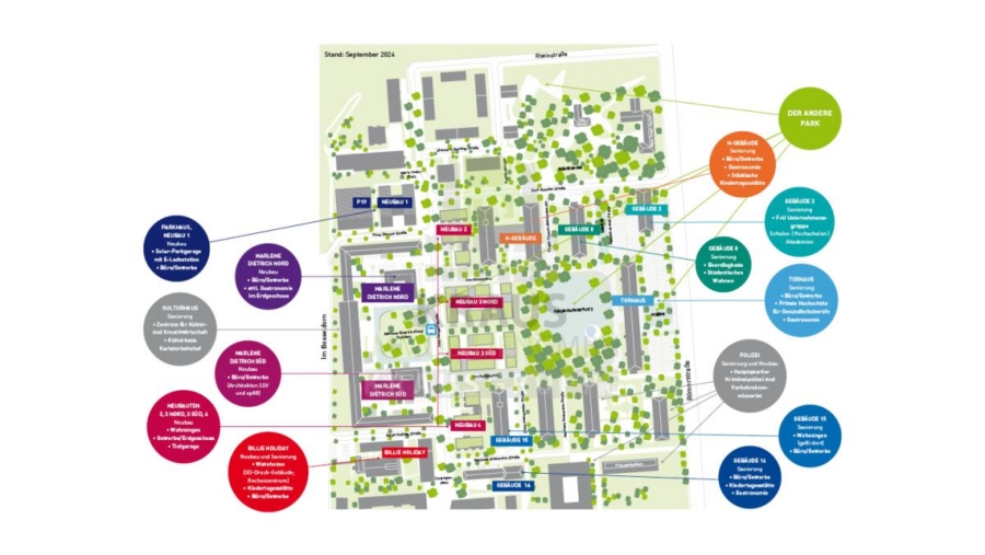 Der besondere Clou in Campbell Heidelberg und Mark Twain Village ist das gemeinsame Herzstück: DER ANDERE PARK. Auf rund fünf Hektar verbindet dieser als Projekt der internationalen Bauaustellung Heidelberg (IBA) verschiedene Orte des Quartiers durch Freiräume und Grünflächen – und dient damit der Entspannung und Erholung unmittelbar vor der Tür.